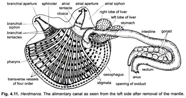 (i) It is complete which starts from mouth and opens at the end of rectum by anus. Mouth is present at the tip of branchial siphon.