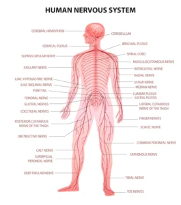 Nervous SystemThe nervous system serves as the body’s main messaging center. It controls the body’s interaction with its environment by allowing thought, memory, and motion. It also enables the functioning of the senses such as taste, touch, sight, hearing, and smell. These processes occur through messages sent along specialized nerve cells called neurons.The central nervous system consists of the brain and spinal cord. The peripheral nervous system consists of nerves that lie outside the central nervous system. It sends information to and from the central nervous system. The peripheral nervous system has two parts. The autonomic nervous system controls the involuntary functions of the heart, smooth muscle and many of the glands in the body. The somatic nervous system sends signals from the central nervous system to the skeletal muscles to mediate voluntary movement. Ganglia are nerve clusters that function to relay nerve impulses by connecting the central and peripheral nervous systems.