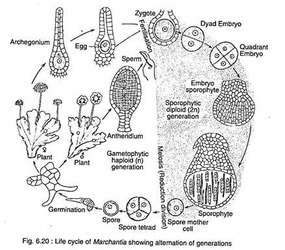 Life cycle of Marchantia is diplohaplontic and is characterized by sporogenic meiosis and heterologous type of alternation of generations. There Occur two morphologically and cytologically distinct individuals in the life cycle of Marchantia; the haploid gametophyte meant for the production of gametes and diploid sporophyte meant for the production of haploid spores.Both the haploid and diploid phases are represented by multicellular structures. The main free-living plant body is the gametophyte (haploid). The short-lived sporophyte (diploid) stage is dependent on the gametophyte for anchorage and nourishment.